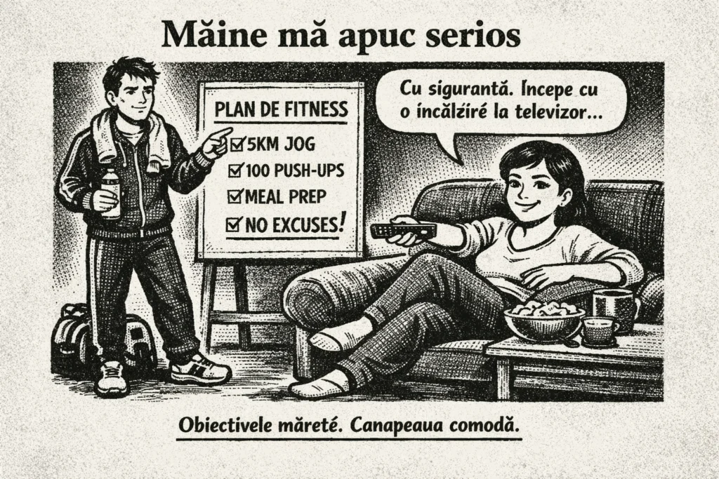 Un portret sincer al acelui moment nobil în care omul își reorganizează viața complet, atât timp cât schimbarea începe convenabil din ziua următoare. Ambiția e prezentă, planul e impecabil, iar ea, ca de obicei, are propunerile cele mai bune.