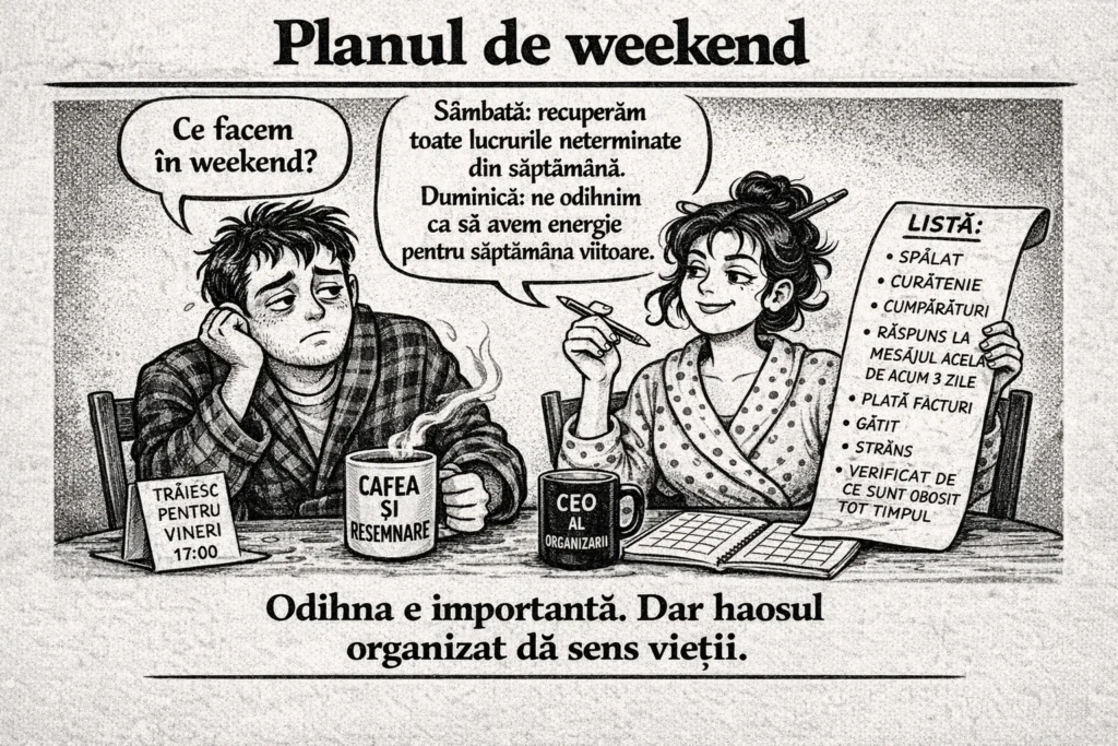 Există mereu acel moment delicat în care întrebi ce facem în weekend, de parcă răspunsul ar putea include odihnă. În realitate, weekendul este doar săptămâna, dar în haine mai comode și cu pretenții nerezonabile.